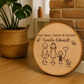 Dank der individuellen Gravur mit Familiennamen und Vornamen wird die Baumscheibe zu einem einzigartigen Unikat und einer bleibenden Erinnerung. Sie eignet sich ideal als persönliches Dekoelement im Eigenheim – sei es an der Haustür, auf einem Sideboard, im Flur, im Wohnzimmer oder als dekorativer Blickfang im überdachten Außenbereich. Auch zum Einzug, zur Einweihung einer Wohnung oder als liebevolles Geschenk für Familien & Freunde ist diese Holzscheibe eine wunderschöne Wahl. Ihre warme Ausstrahlung und die charmante Strichmännchen-Illustration zaubern sofort ein Lächeln auf die Lippen.